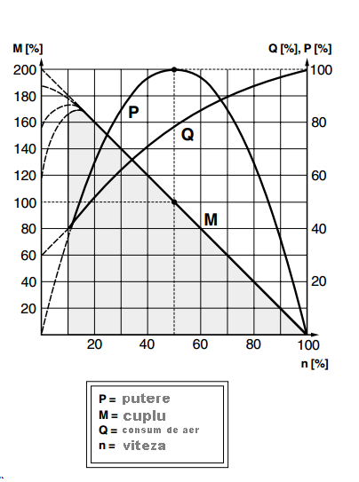 Caracteristicile legate de performanta, a fiecarui motor sunt ilustrate in graficul de mai jos, prin care cuplul, puterea si consumul de aer pot fi citite ca si functii ale vitezei. Puterea este la nivelul zero atunci cand motorul e stationar, dar si cand functionaeaza la viteza libera (100%) fara incarcatura. Puterea maxima (100%) este dezvoltata de in mod normal atunci cand motorul duce o incarcatura la aproximativ jumatate din viteza libera (50%).